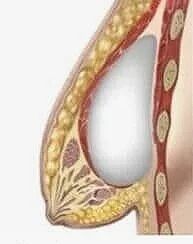 Snoopy / waterfall deformity. The breast tissue (yellow) has dropped over the implant (white), which is held under the muscle (red layer).